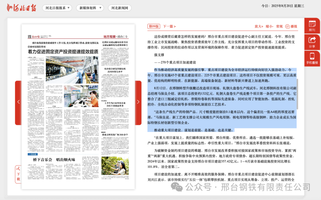 8月12日,在邢鋼轉型升級搬遷改造項目現(xiàn)場,軋鋼大盤卷生產(chǎn)線試車。河北邢鋼科技有限公司副總經(jīng)理馬保良介紹,該項目總投資約132億元,軋鋼大盤卷生產(chǎn)線是整個項目第一條投產(chǎn)的生產(chǎn)線,它整合了進口三輥減定徑軋機、普銳特卷取機等國際先進裝備,同時應用了智能加熱、低溫軋制、控軋控冷、全線自動化控制等多項特鋼軋制前沿工藝技術。“這條生產(chǎn)線生產(chǎn)的特鋼產(chǎn)品,尺寸精度能控制在0.1毫米以內,這個偏差比一張A4紙的厚度還要薄。”馬保良說,新工藝將支撐公司大規(guī)模生產(chǎn)風電用鋼、核電用鋼等特高級鋼種,助力企業(yè)成長為國際特鋼長材創(chuàng)新型引領企業(yè)。