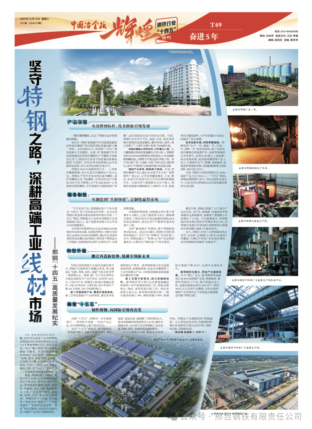 5年,在歷史長河中不過一瞬,但對專注高端工業(yè)用特鋼線材領(lǐng)域的邢臺鋼鐵有限責任公司(以下簡稱邢鋼)而言,卻足以完成一次從“精工制造”到“定制化賦能”的蝶變。作為中國特鋼線材領(lǐng)域的“單打冠軍”,邢鋼堅持“做精、做專、做強”的發(fā)展戰(zhàn)略,以創(chuàng)新為引擎,以定制化服務(wù)為紐帶,開創(chuàng)了一條專業(yè)化、高端化精品之路,在“十四五”期間交出了一份厚重的高質(zhì)量發(fā)展答卷。