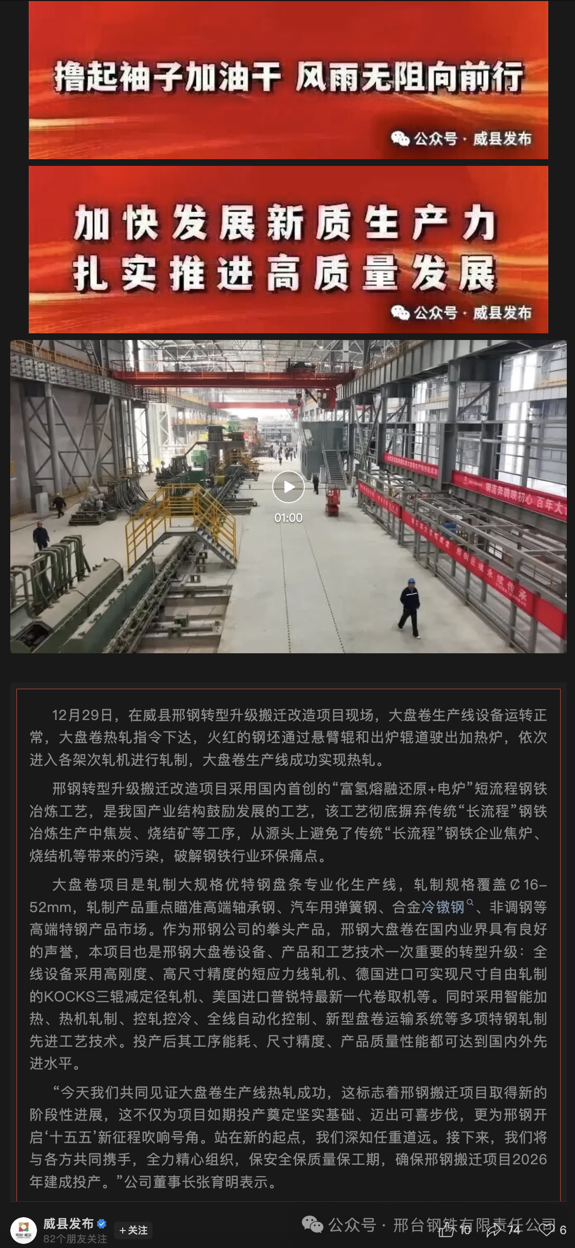 “今天我們共同見(jiàn)證大盤卷生產(chǎn)線熱軋成功,這標(biāo)志著邢鋼搬遷項(xiàng)目取得新的階段性進(jìn)展,這不僅為項(xiàng)目如期投產(chǎn)奠定堅(jiān)實(shí)基礎(chǔ)、邁出可喜步伐,更為邢鋼開啟‘十五五’新征程吹響號(hào)角。站在新的起點(diǎn),我們深知任重道遠(yuǎn)。接下來(lái),我們將與各方共同攜手,全力精心組織,保安全保質(zhì)量保工期,確保邢鋼搬遷項(xiàng)目2026年建成投產(chǎn)。”公司董事長(zhǎng)張育明表示。