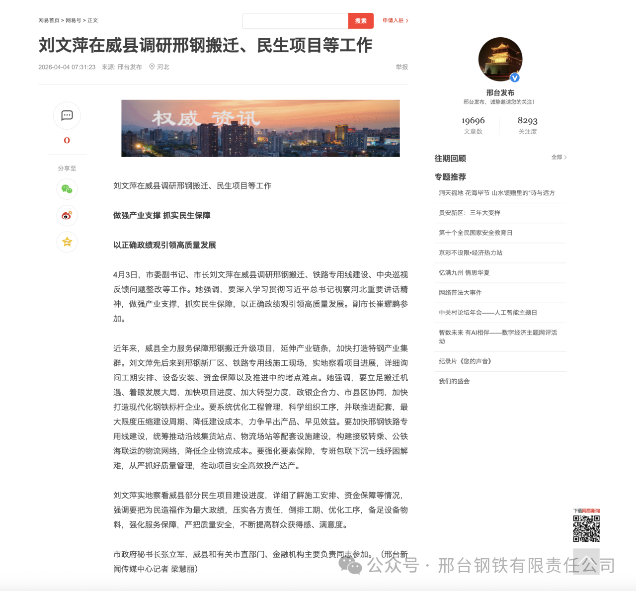 4月3日,市委副書記、市長劉文萍在威縣調研邢鋼搬遷、鐵路專用線建設、中央巡視反饋問題整改等工作。她強調,要深入學習貫徹習近平總書記視察河北重要講話精神,做強產業(yè)支撐,抓實民生保障,以正確政績觀引領高質量發(fā)展。副市長崔耀鵬參加。